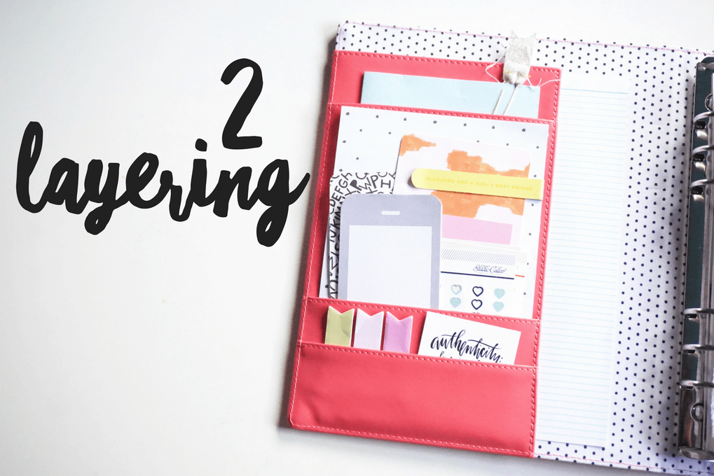 Because of the very nature of planner pockets, layering is a must! Don’t be afraid to layer different items on top of each other to create depth and interest. Even if you have a large pocket, you can layer a bunch of items from taller pieces (in the back) to shorter pieces (in the front). Using clips is also a great way to add layers – you can make certain pieces pop by adding a planner clip!